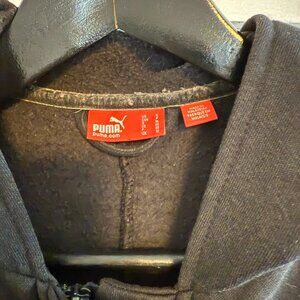 Elevate your outerwear game with this sleek black PUMA duffle-style coat. Featuring classic wooden toggle closures, a cozy hood, and a belted waist for a flattering silhouette, it blends timeless design with sporty edge. The iconic white PUMA logo adds a subtle branded touch on the chest. Perfect for layering in cooler weather—whether you're heading to work or weekend errands.