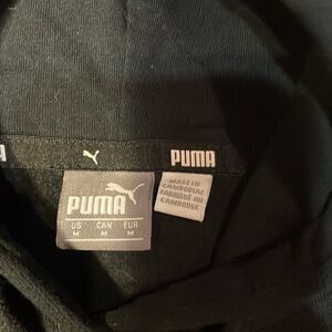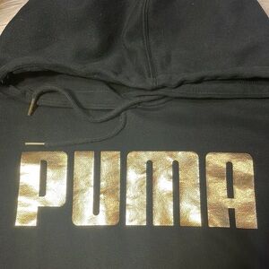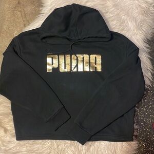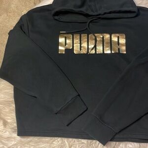Medium Pullover hooded sweatshirt Black with metallic gold PUMA on chest Drawstring hood with gold accents Super soft with fleecy inside lining Shorter crop length Long sleeves casual and comfy. Measurements are in pictures