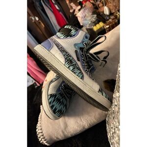 Iridescent purple shimmer color w/ teal/mint green/aqua zig zag/spike lighting/heartbeat heart rate spike design w//black & white contrast shoelaces - Size 7.5 womens (mens size 5.5/6, kids If you have any questions please feel free to message me I have several other listings available I accept offer and bundles don’t miss out on this high fashion throwback kicks Which are no longer sold in stores and will make a statement for campus back to school Christmas or any of the above no