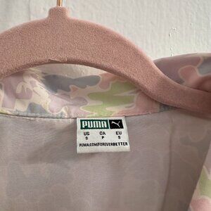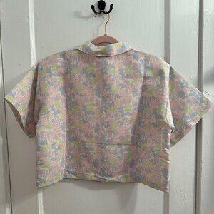 Adorable pastel floral button-up from PUMA, featuring a boxy cropped fit and soft, silky polyester fabric. The shirt has a relaxed, pajama-style collar and light pink, green, blue, and white floral print throughout. Comfortable and stylish — perfect for spring or summer!