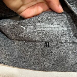 PUMA women’s sports bra, size Large. Features a soft seamless knit fabric in dark heather gray with a black PUMA logo on the band. Light to medium support with a smooth, stretchy feel perfect for yoga, gym sessions, or daily wear. Breathable and flattering with a scoop neckline and racerback design.