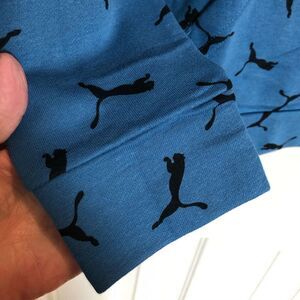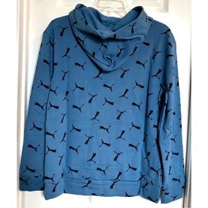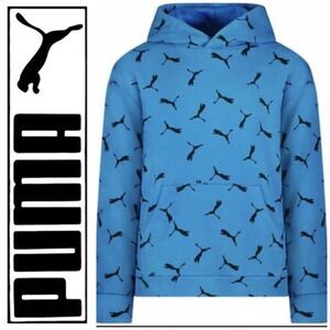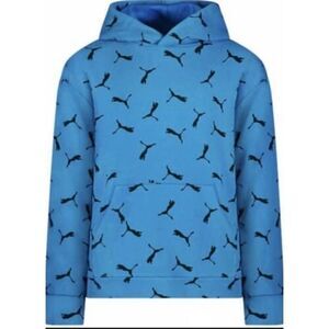 Cute Puma Youth (unisex) French Terry All-Over-Logo Hoodie in size large (14–16). Long sleeved in vibrant blue with the Puma Cat logo throughout, it features kangaroo pockets. The shell is 70% cotton and 30% polyester; the hood lining is 60% cotton and 40% polyester. Machine washable (cold) on gentle cycle and tumble dry on low. This poly/cotton blend makes it super comfortable. MSRP $40. The pit-to-pit measurement is 19.5”, the length is 25” and the sleeves are 22.5”. Really cute, soft and NWT!