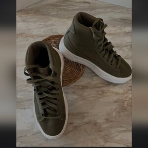 Chic army green high-tops featuring a sleek white sole. Ideal for everyday style.
