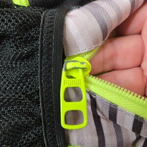 The bold PUMA logo has some markings of a purple gel-type pen in several places. One small nick in the graphic. Some paint chips on the zipper pulls and some ink staining on the inside. Has been freshly cleaned and is ready to use. So much life left, save it from the landfill. Please see all photos for details.