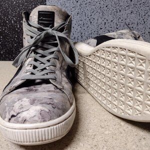The PUMA'S are lace-up men's size 10.5 Gray/Blk mid leather trainers. The sneakers are pre-owned and in good condition.