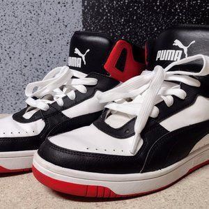 Puma Rebound Joy sneakers with a White -Puma Black -High Risk Red are a men's size 11. The sneakers are pre-owned and in good condition good for everyday wear and activities.