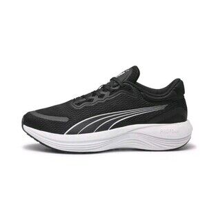 Elevate your running experience with these sleek and stylish PUMA Scend Pro athletic sneakers. Designed with a breathable mesh upper material and a cushioned lining, these shoes provide comfort and support for running and jogging. The low top shaft style and lace-up closure ensure a secure fit, while the solid black color with white accents adds a touch of style to your outfit.