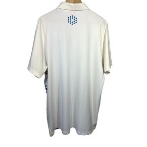 Purchased from Tullymore Golf Resort. Pullover. Three button front closure. Spread collar. Short sleeves. Embroidered logo at left sleeve and chest. Front is white with turquoise and shades of green abstract horizontal stripes. Solid white collar, sleeves and waffled back. Stretch material. Moisture wicking. Quick dry. Lightweight. Cooling. Golf. Sporty. Activewear. Resort. Country club. Snowbird. Casual. A