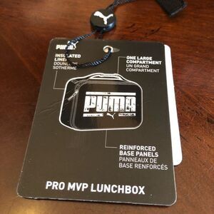 Store lunch and treats in style with this kids' Puma Pro MVP Lunch Bag. Polyester shell with a zip-around closure and top webbed handle with release clip. Insulated cooler lining and printed logo on front. It has a spacious compartment for lunch containers, snacks and utensils. Perfect size at 9" x 9.25" x 3.25". This is NWT and in original packaging.