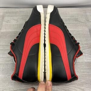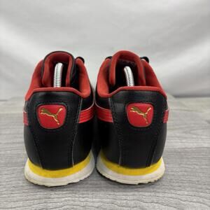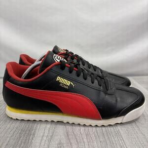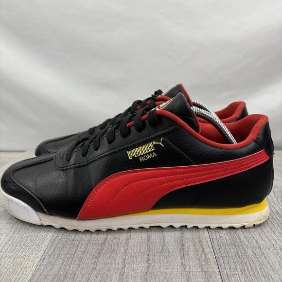 Description: Up for sale is a classic pair of PUMA Roma sneakers in a sleek black synthetic leather finish with a bold red Formstrip and yellow midsole accents. These heritage shoes feature gold foil branding and a lightweight EVA midsole for comfort.