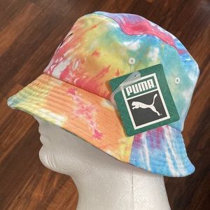 PUMA Tie Dye Bucket Hat Rainbow features pastel rainbow colors pink blue yellow green white beautifully blended into a tie dye design with a graphic black Puma Cat Logo in front Center.
