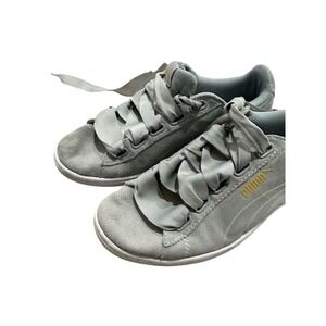 Keywords: Puma, Vikky Ribbon, women's sneakers, gray suede, satin ribbon tie, soft foam insole, durable rubber outsole, casual wear, athletic style, pre-owned.