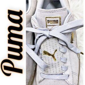 PUMA Vikky Suede Leather Classic Sneakers In Puma White & Gold Metallic Logo, Size 7C