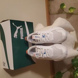 Chic PUMA sneakers. White base with blue and orange details. Ideal for daily adventures. Worn only once for a short period of time. Very little sign of ware. Puma RS-Master size 8.5 in original box.