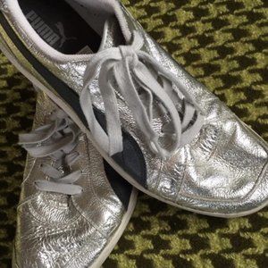 Very cool silver leather sneakers for men marked 8.5. No scuffs fading sain the sole is 11 1/4 shoe is the picture next to it is a Clarks size 8.5