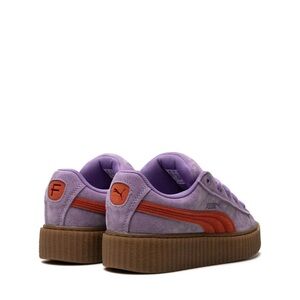 These Creeper Phatty sneakers are born from a collaboration between PUMA and Rihanna's brand FENTY. This purple rendition is wrapped in sumptuous calf suede with a signature padded Formstrip logo adorning the sidewall in a contrasting burnt-orange hue. They're complete with a creeper-style platform sole made from gum rubber that lends the pair its name.