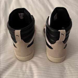 Stylish high-top sneakers in white and black. Features lace-up design and ankle strap. Worn once, like new.