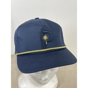 This is a rare PUMA x Palm Tree Crew x Rickie Fowler Snapback Golf Hat in Navy Blazer/Gold color. It features a solid pattern with an adjustable snapback style. The hat is designed for men and is part of a special collaboration with Rickie Fowler and the Palm Tree Crew theme. It is suitable for golfing and can be worn in various seasons. The model is a sample from a photo shoot.
