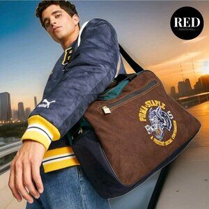 BRAND NEW - NWT- The PUMA x STAPLE Messenger Bag is a large, sturdy duffel bag perfect for school or travel. With a solid multicolor pattern and vintage varsity theme, this messenger bag is both stylish and functional. Made of canvas with a fabric lining, it features a zip closure, crossbody strap handle style, and various pockets for organization. The bag is lightweight, water-resistant, and the limited edition design makes it a standout accessory for those who appreciate art, streetwear fashion, and a touch of collegiate flair.