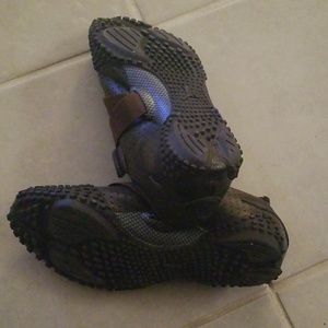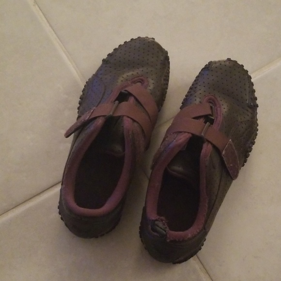 Brown leather w/ velcro closure. Tare on bk of right shoe. Otherwise great looking. See photos. I also have a blk pair w/o any holes or tares. See photos.
