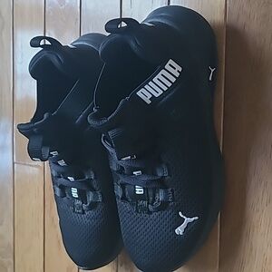 Pumas Black & White for Kids... Black sneakers with white PUMA writing on tongue, and side & white puma symbol on back side and near the front right side