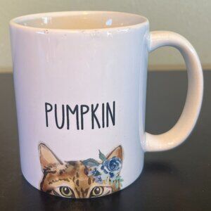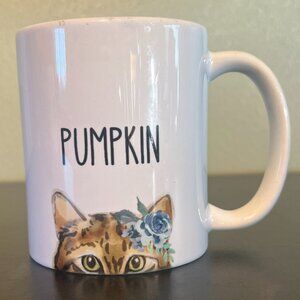 What’s not to love about a cute cat nicknamed Pumpkin peeking out from the base of your white ceramic mug? Both sides feature the upper portion of a cat’s face with prominent green eyes and blue flowers decorating its right ear. Black text above kitty reads, PUMPKIN. Measures 3.75” tall with a 3” diameter. Holds 11 fluid oz. Underside features Orca Whale logo and reads Orca Coatings.