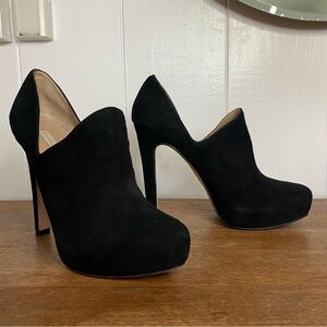 Closed toe high heel bootie with a unique shape / modern silhouette.