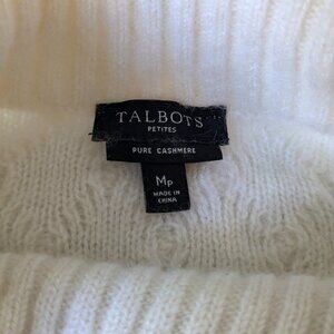 100% cashmere white cabled sweater from Talbot's, size medium petite. Folded-over mockneck and three-quarter sleeves with a mix of textured stitches like cables and seed stitch. Like new condition.
