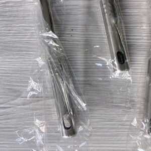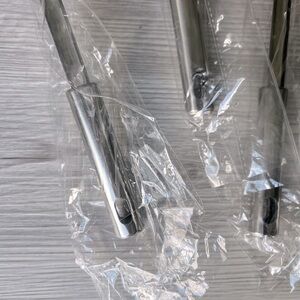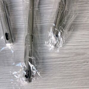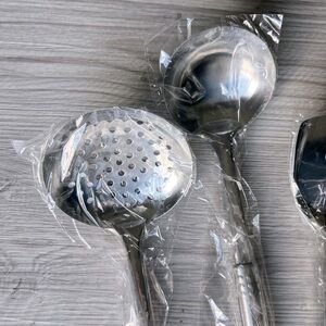 Pure Cut titanium utensils set. Stainless steel handles. Set includes one spatula, one skimmer, one dipper, and one turner. Lightweight. Antibacterial and odor free. Easy to clean. Heat proof and nontoxic. New with tags, each utensil is in a separate plastic bag.