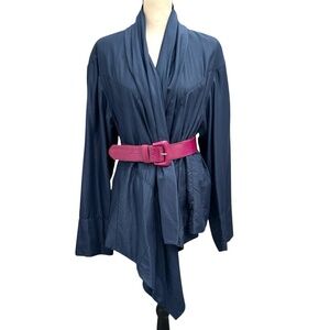 Pure DKNY blue silk open jacket coat. In excellent preowned condition. Shown with a belt for styling idea - belt not included.