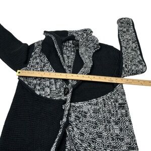 Cozy up in timeless style with this Pure Handknit cardigan. Crafted from soft cotton yarns, it features a striking black and white marled knit pattern mixed with solid black panels for a modern patchwork look. The oversized shawl collar drapes beautifully, while the three-button front and front patch pockets add both style and function.