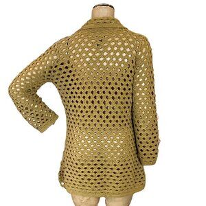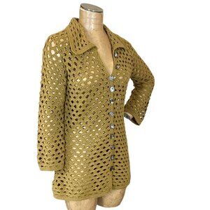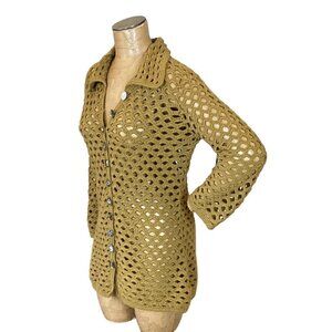 This beautiful unique mustard brown open-knit cardigan is made of 100% cotton. It has a split V-collared neckline, long sleeves, and unique gem rhinestone buttons. The knit style is open-weave and the pattern is fishnet. The brand is PURE Handknit and the fit is regular for size S/M. The sweater is suitable for travel, parties, casual wear, and business. It is recommended to hand wash only. The style is a mix of coastal grandma, indie, retro, hipster, grunge, 80s, 90s, eclectic, artsy, art-to-wear, cottagecore, grandmacore, and bohemian. It is stretchy, breathable, and perfect for winter, fall, and spring.