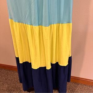 Embrace vibrant style with this sleeveless maxi dress. Featuring a stunning combination of blue, yellow, and navy, this dress is perfect for any occasion. Enjoy the comfort and elegance it brings to your wardrobe.