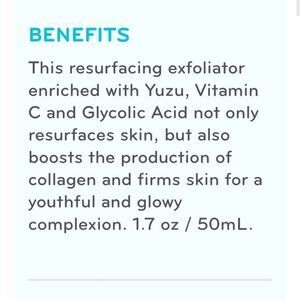 This resurfacing exfoliator enriched with Yuzu, Vitamin C and Glycolic Acid not only resurfaces skin, but also boosts the production of collagen and firms skin for a youthful and glowy complexion.