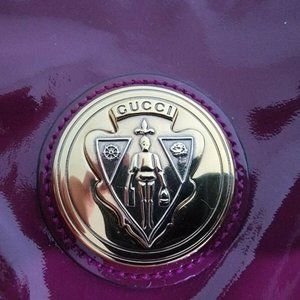 PURPLE, PATENT LEATHER GUCCI HYSTERIA GOLD MEDALLION CLUTCH