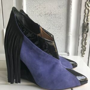 Unbelievable! Gorgeous handmade in Brazil. Stunning 100% suede/Black Patent Leather with fringe at heel. Super sexy. New, never worn. Show stopper in these💜wedge=4”. Pointed toe for extra sexiness