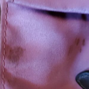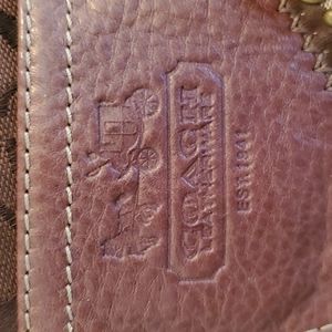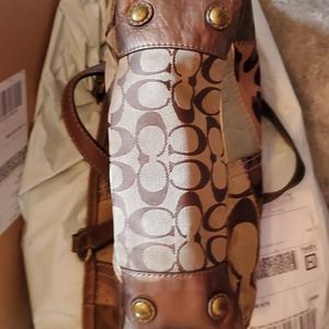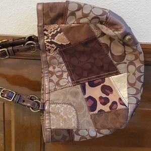 Authentic Coach Patchwork Handbag with 2 hand Straps & 2 outside slip in pockets on each end & 2 slip in pockets inside & 1 zipper pocket inside. 2 pockets inside have stains shown in picture's and a number on lining inside the zipper pocket also shown in picture's