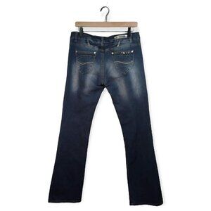 These jeans by Puzzle Classic Wear are a distressed wide leg jean with a sewn-in decorative metal word on the back pocket that says "love". They have a 5 pocket silhouette and a zip/button closure. These jeans are in excellent condition and are free from any visible flaws.