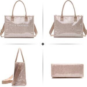 Features: Durable double-layer construction with a shiny PVC outer and kraft paper inner layer, offering a sleek look and waterproof protection. Wide, flat bottom helps it stand upright, and the design includes a main compartment, zippered inside pocket, and two additional pockets—ideal for staying organized on the go. The wide shoulder strap makes it comfy to carry all day.