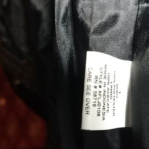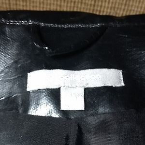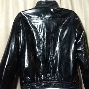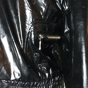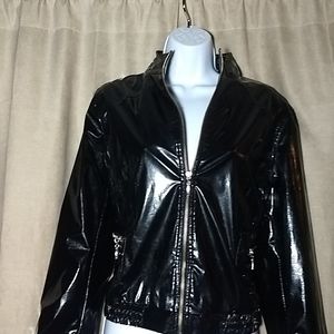 PVC black front zip jacket NWOT.Two zip pockets, gathered, elastic waist , sateen lining jacket measures 21 in in length, sleeves are 24 inches.