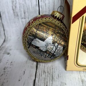 PYRAMID Victorian Style 90s Satin Sheen Christmas Ornaments 1990 1991 1994 Rauch Gold Glitter Trim 2 Scenery and Child With Lamb set of 3