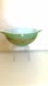 Pyrex Medallion 2½ quart Cinderella Casserole. The bowl is light sage green and features a gold design of leafy vines twining around sharp, angled starbursts. No chips, smooth rims. SIZE: 2½ quart (443).