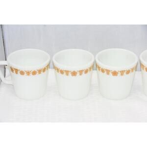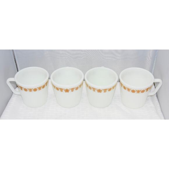 PYREX BUTTERFLY GOLD MILK GLASS CUPS #1410 Flat Coffee Mugs X-4