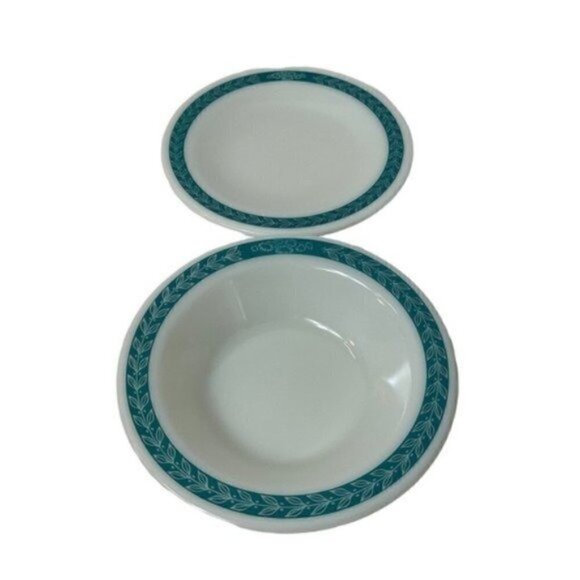 PYREX brand Tableware by Corning turquoise Laurel Leaf & flowers Bowl & Plate
