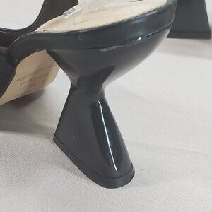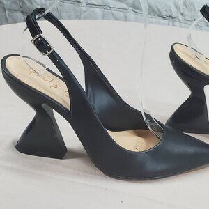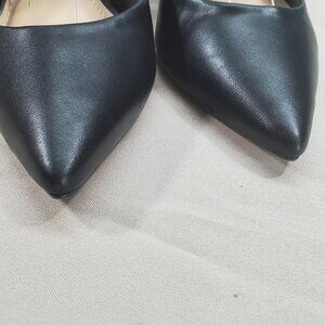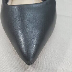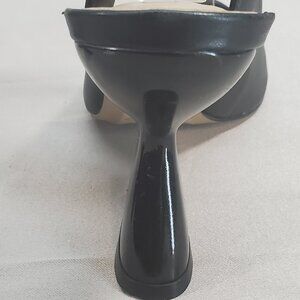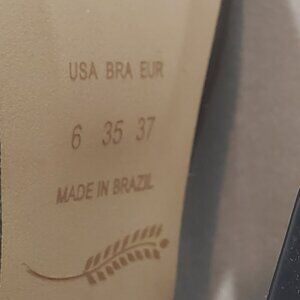 Beautiful, gently used black leather upper. Brazilian made of impeccable quality. There are a couple of minor dings on the top of the heel and a slight flaw on the right heel that is barely visible. The heel is approximately 3 inches.