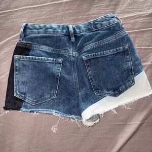 Stylish PacSun denim shorts with a unique colorblock design. Features shades of blue, black, and white.