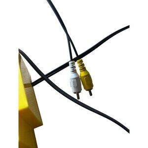 Connects to TV via built-in AV RCA composite cables (yellow video, white audio).