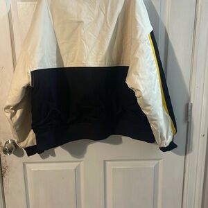 Stylish PacSun puffer with bold racing design. Features snap buttons and color block details. Perfect for a modern look.