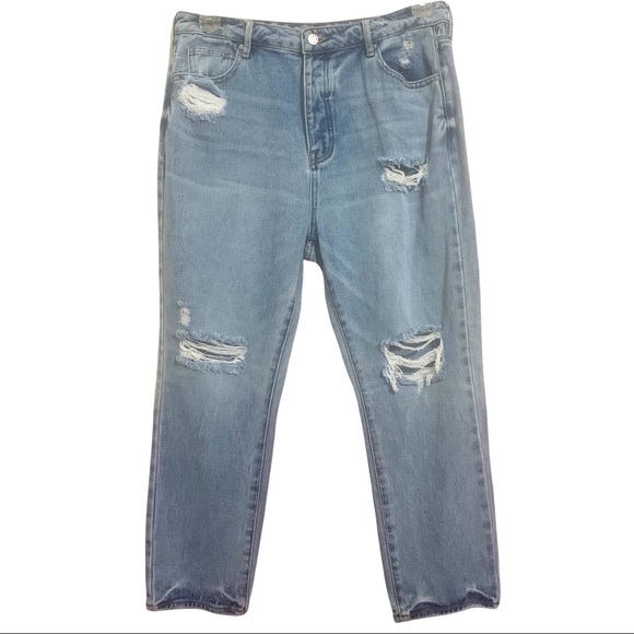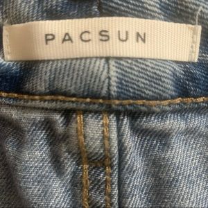 These high rise jeans from PacSun feature a stylish distressed design with carefully placed rips and frayed edges, offering a trendy, worn-in look. The blue denim wash is consistent with natural fading, making them perfect for a casual, laid-back style.