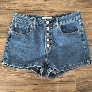 These PacSun blue jean button fly mom shorts offer a trendy high-waisted fit with a stylish cuffed hem. Crafted from quality denim, they provide a comfortable and casual look perfect for everyday wear.
